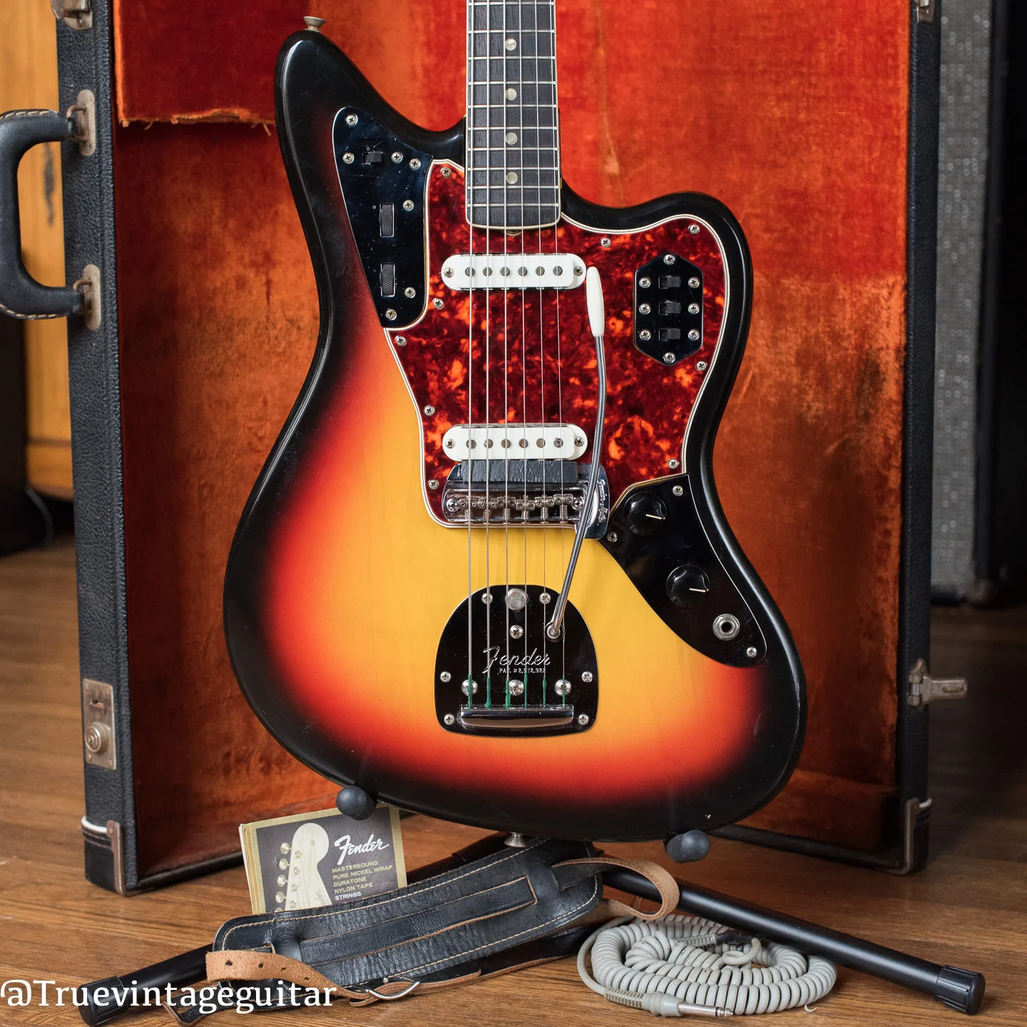 Notes: This clean Jaguar is now ready for the stage, studio, collection. I personally love the slab Rosewood fretboard because it is an added neck stabilizer, rounds off the high frequencies just slightly, and is a cool point in Fender history. This example is pleasing to look at but also has the cool vintage vibe and history. The original case shows plenty of wear from storage. One of the latches is a little bent but still engages. I’m including the original leather strap, coily cable (probably doesn’t work well), and some of the original Fender branded string packets found in the pocket of the case. I’m confident you’ll be thrilled with the tone and playability of this clean 1966 Fender Jaguar!