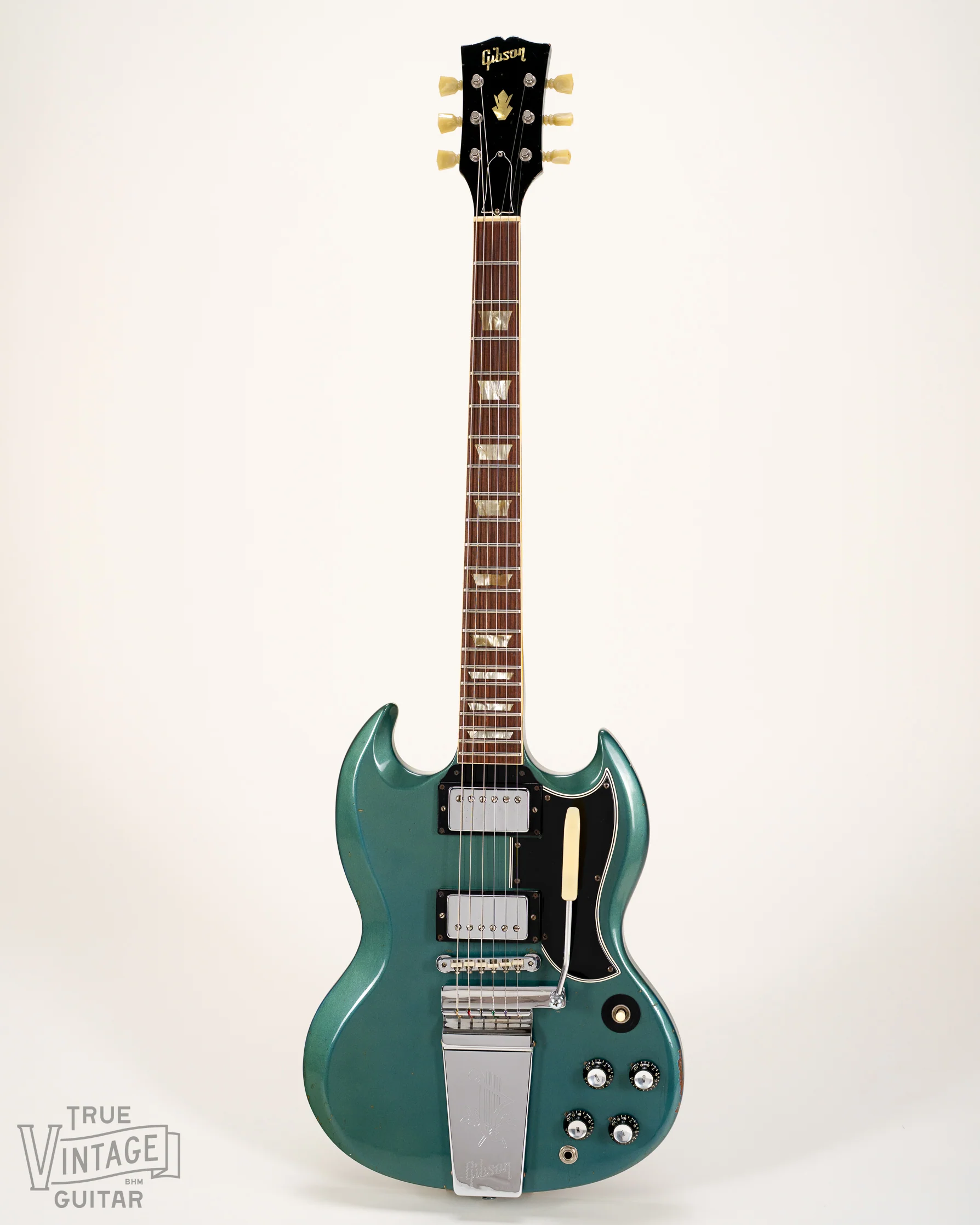 I flew into Chicago, Illinois to buy this amazing 1966 Gibson SG Standard in factory original Pelham Blue finish from the son of its original owner. I was stunned to find it completely original except for the screw holding the tremolo arm to the plate. I inspected the neck and body and found no neck breaks, repairs, or issues of any kind. When asked about the history of the guitar, the seller showed me the picture of his dad playing the SG with his band with awesome Kiss-like facepaint. I can tell that the guitar was played and loved; the care slightly less than "babied", but it was clearly respected and utilized as the tool it was meant to be.